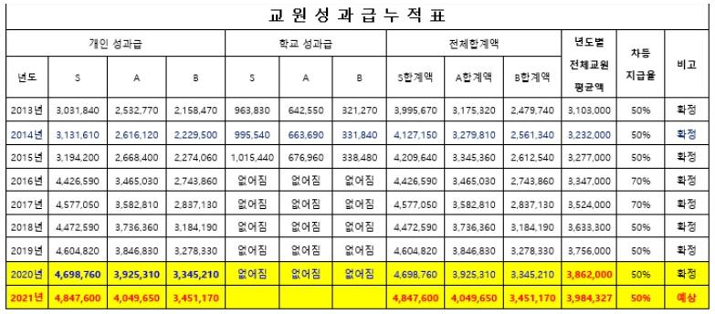 2021 교사 성과급 지급금액은 대략 다음과 같을 전망입니다.